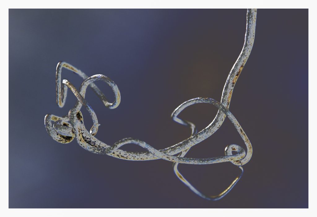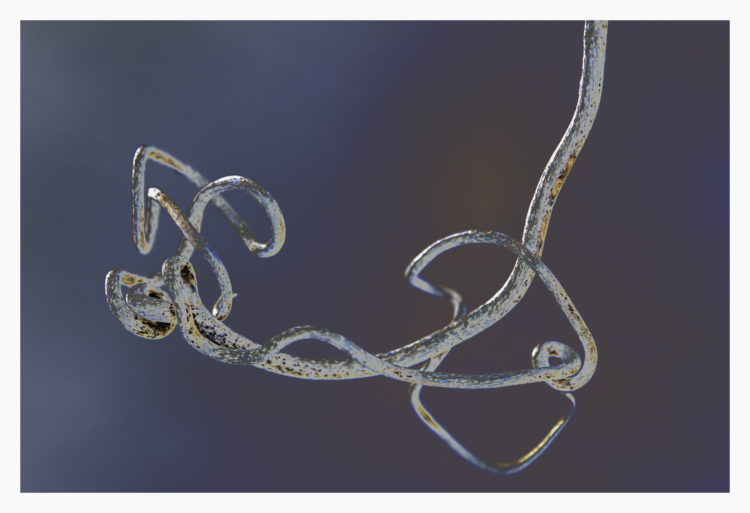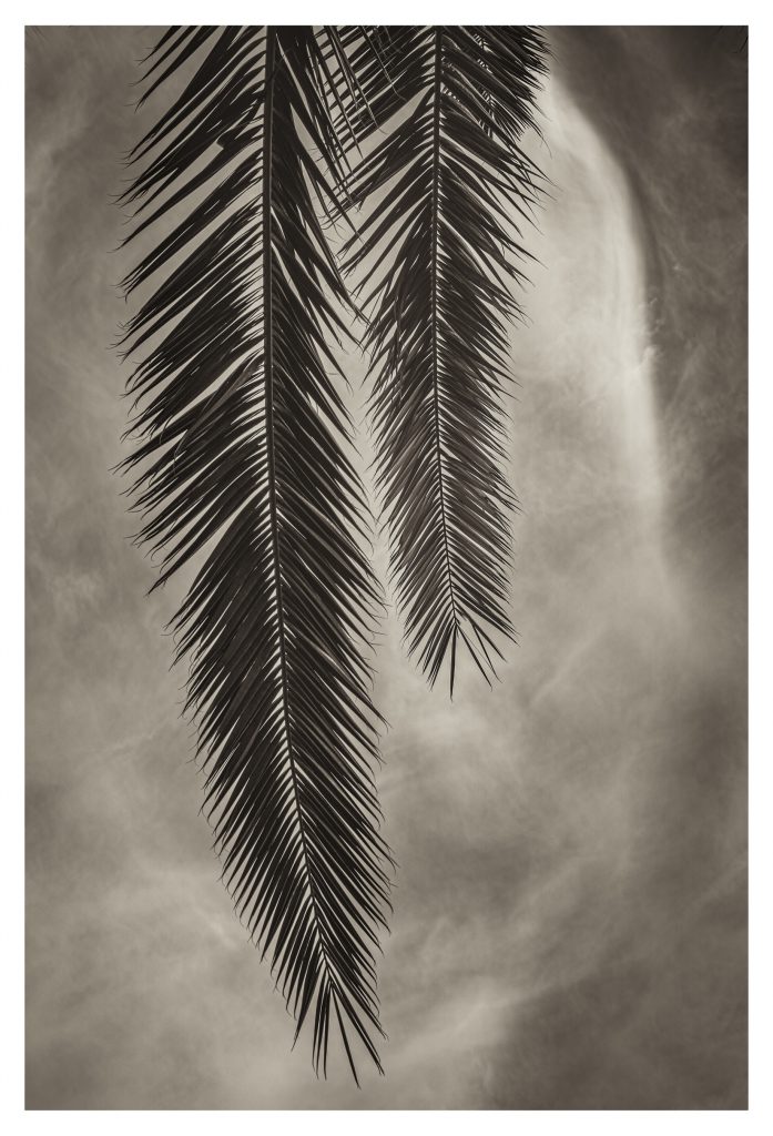 The image above is of a wild grapevine, folded up and twisted like a protein molecule, viewed up close with selective focus and near zero detail in its surroundings. The picture below shows two vertical palm fronds against a cold sky, with clouds appearing as if beaten and formed out of metal.