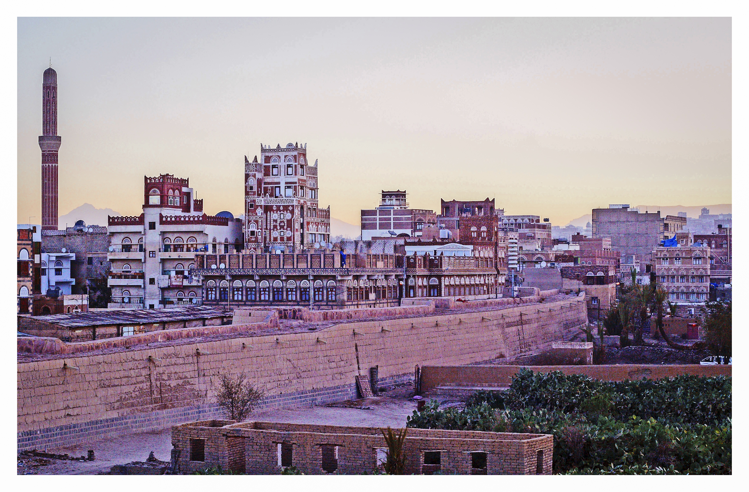 I spent my first days and nights in Yemen with this view from my sleeping room. This is sunrise in the ancient part of Sanaa, the capital city, where the buildings and alleys, stone gates, walls and walkways have not changed since Medieval times. The markets are lively here; their chaos and colorful aggressive vendors refer back to a lost and nearly forgotten way of life. Only a few brave Western travelers appear in the souks or anywhere else downtown Sanaa, Yemen.