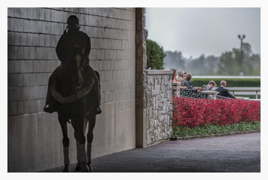 The photo above wants to go in another direction. It is a disturbing image; the subject seems ill-defined and ghostly. It could be murky for a technical reason: the image lacks unified composition. It seems like two separate unrelated images; the horse and rider in the tunnel appears as one subject and the spectators at the track another. The mounted horse lives in monochrome shade, while the racing fans enjoy a world of color, though muted by overcast sky.