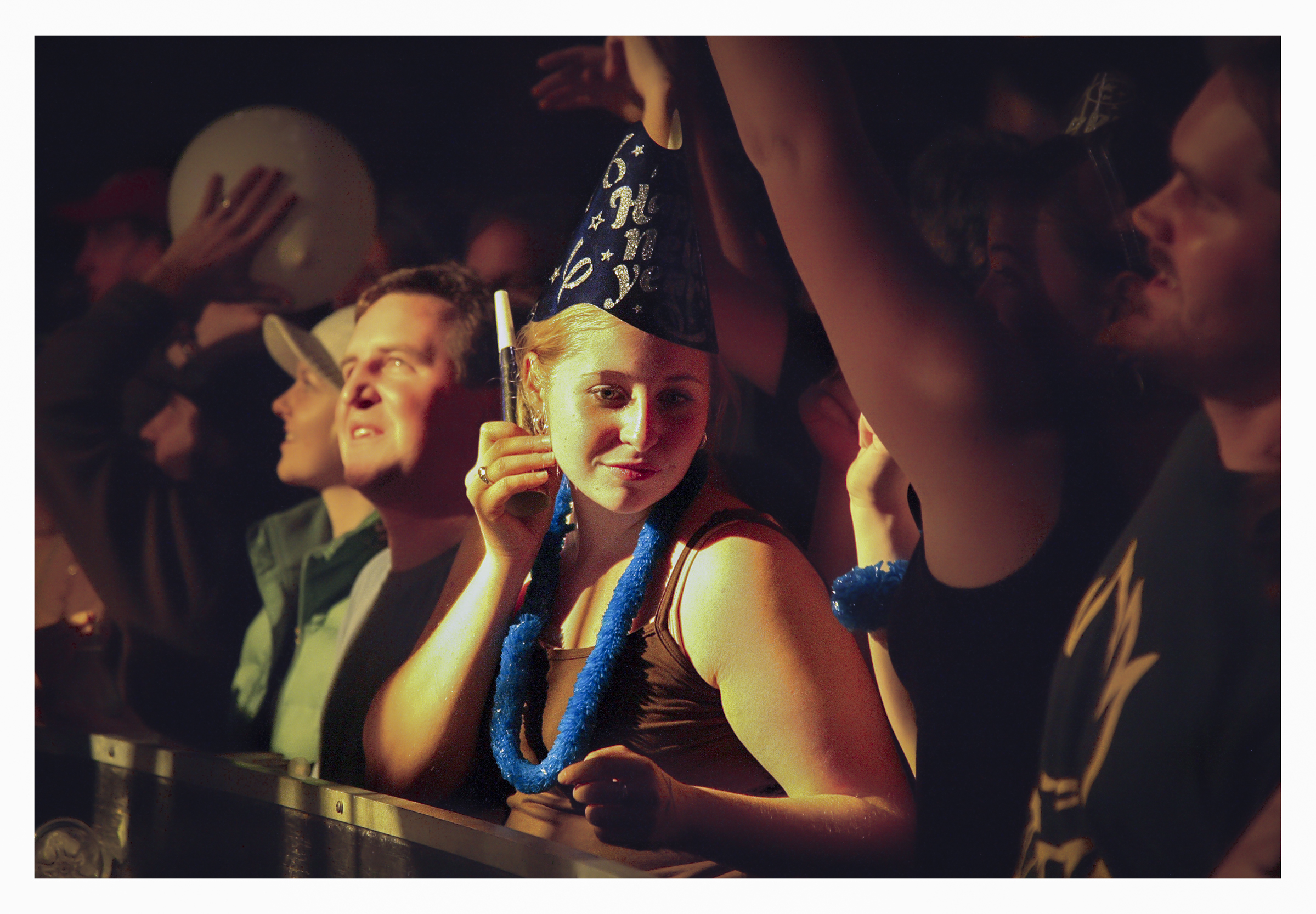 Around her an exuberant gathering quickens. People are tossing balloons, hugging each other and modeling festive headgear. Screams of excited women echo through the building. The band plays Afro-Cuban, muscular loud music in which percussion and horns dominate. On the platform a dance troop performs in a frenzy, spinning and twisting among the wild rhythms. A golden light illuminates Our Lady of Enigmas in a conical hat. She seems in a world apart, not conscious of her raucous surroundings, fondling one earring; that gesture seems an outward sign of her complete abstraction from the scene, though she remains its subject.