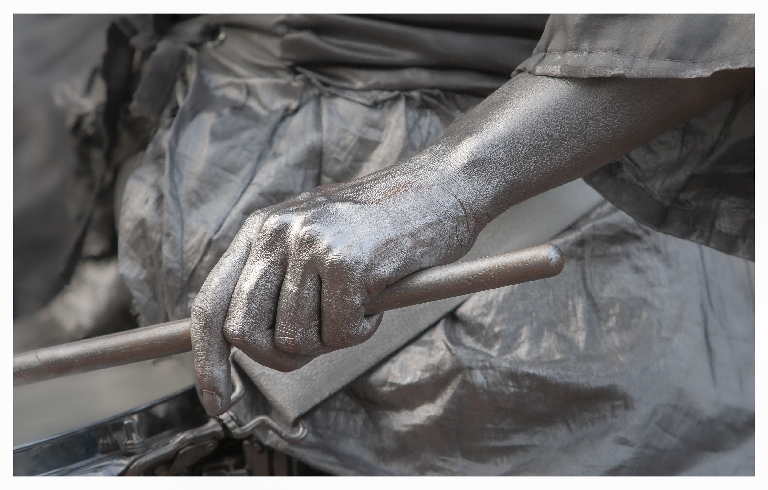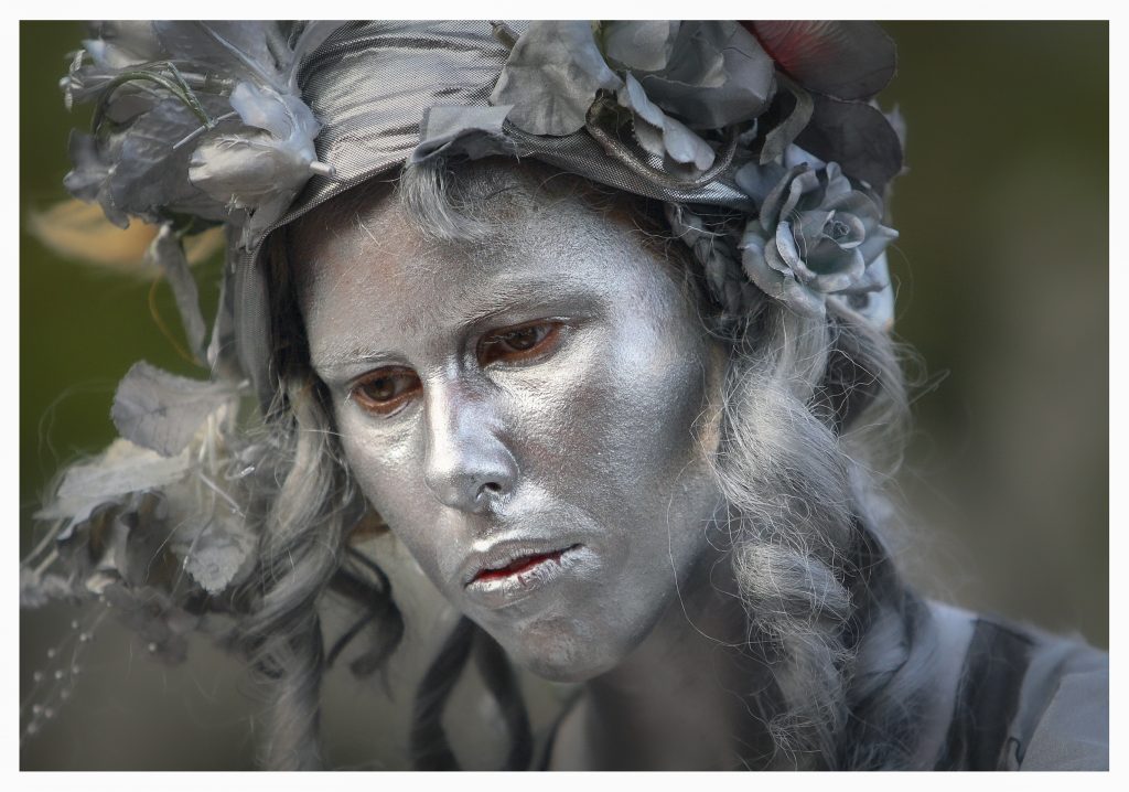 She calls herself a Living Statue. On street corners in Asheville, North Carolina she is known as The Silver Drummer Girl, a woman who has trained her muscles to an extreme degree, and therefore is able to remain utterly still on public sidewalks in excess of five minutes at a time, while standing on a pedestal. Her skin, costume and hair and are painted silver. Around her waist a silver snare drum hangs suspended on a silver belt. In either hand she holds a drumstick poised motionless in midair for extended periods, then suddenly she begins drumming and turning in a mechanical way on her pedestal, like a wind-up toy suddenly loosing its potential energy. It shocks bystanders. You cannot tell beforehand whether she is a living human being or a high technology sculpture.