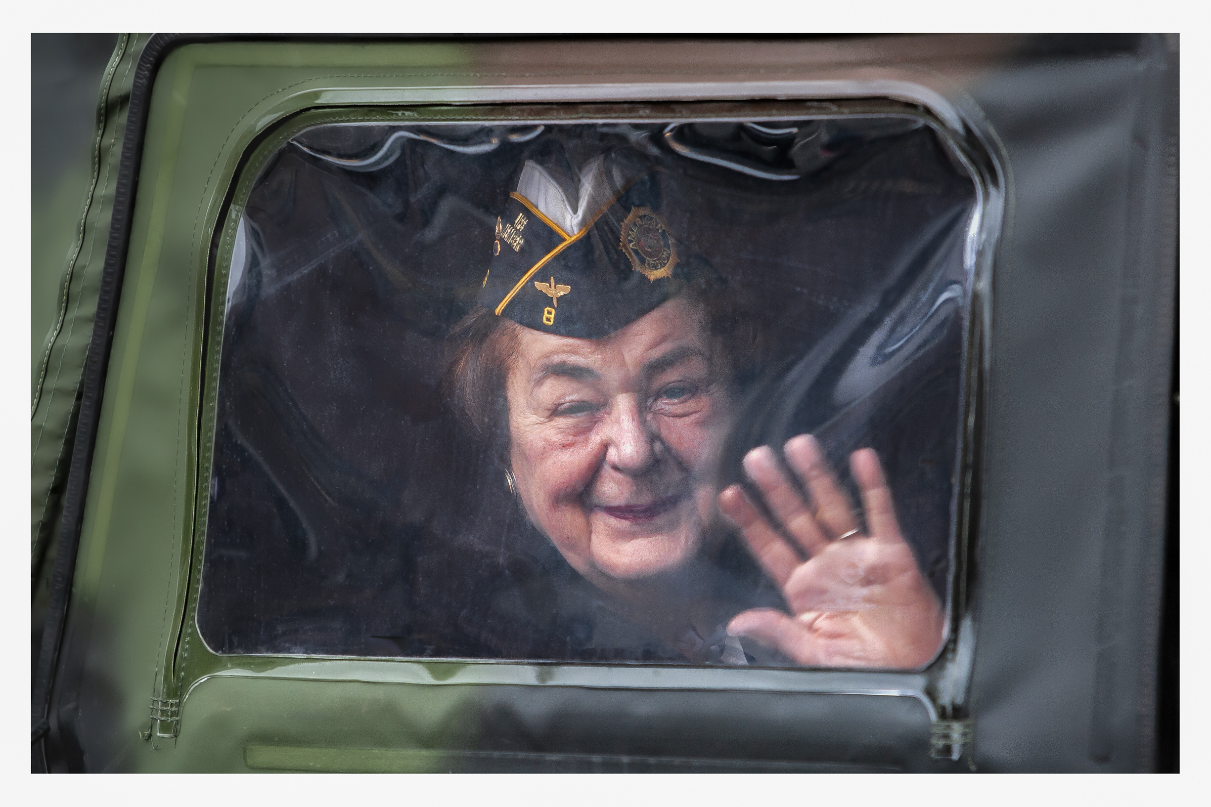 I am now keenly aware I am working with a representation of a deceased human being, captured by me while that person still lived. My photograph is a record of something that no longer exists; not just this narrow slice of a World War II veteran’s life has been lost, but the sentient being herself who waved and looked right at me so pleasantly and openly is gone too. Yet here she is gesturing at us and smiling; that smile seems impenetrable, yet we can believe it was an integral part of her personality, a sign she used in front of people throughout her long life.
