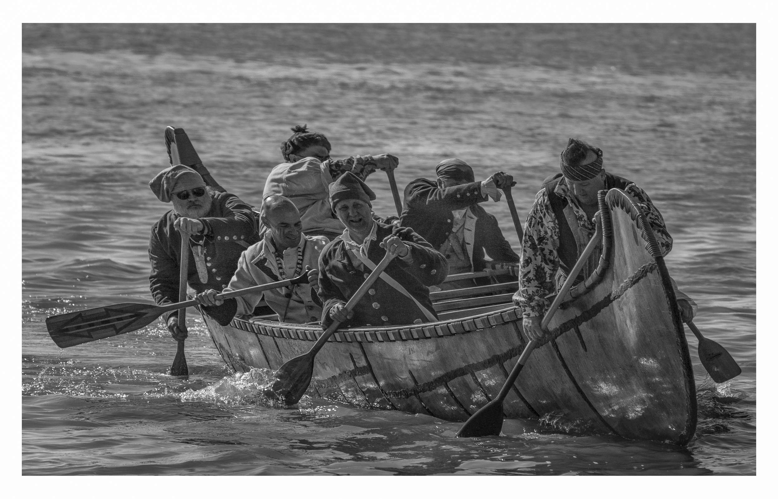 These are 17th Century French fur traders (historical impersonators) angling a canoe toward shore along the Ohio River. A modern detail betrays them, despite their elaborate attempt to deceive.