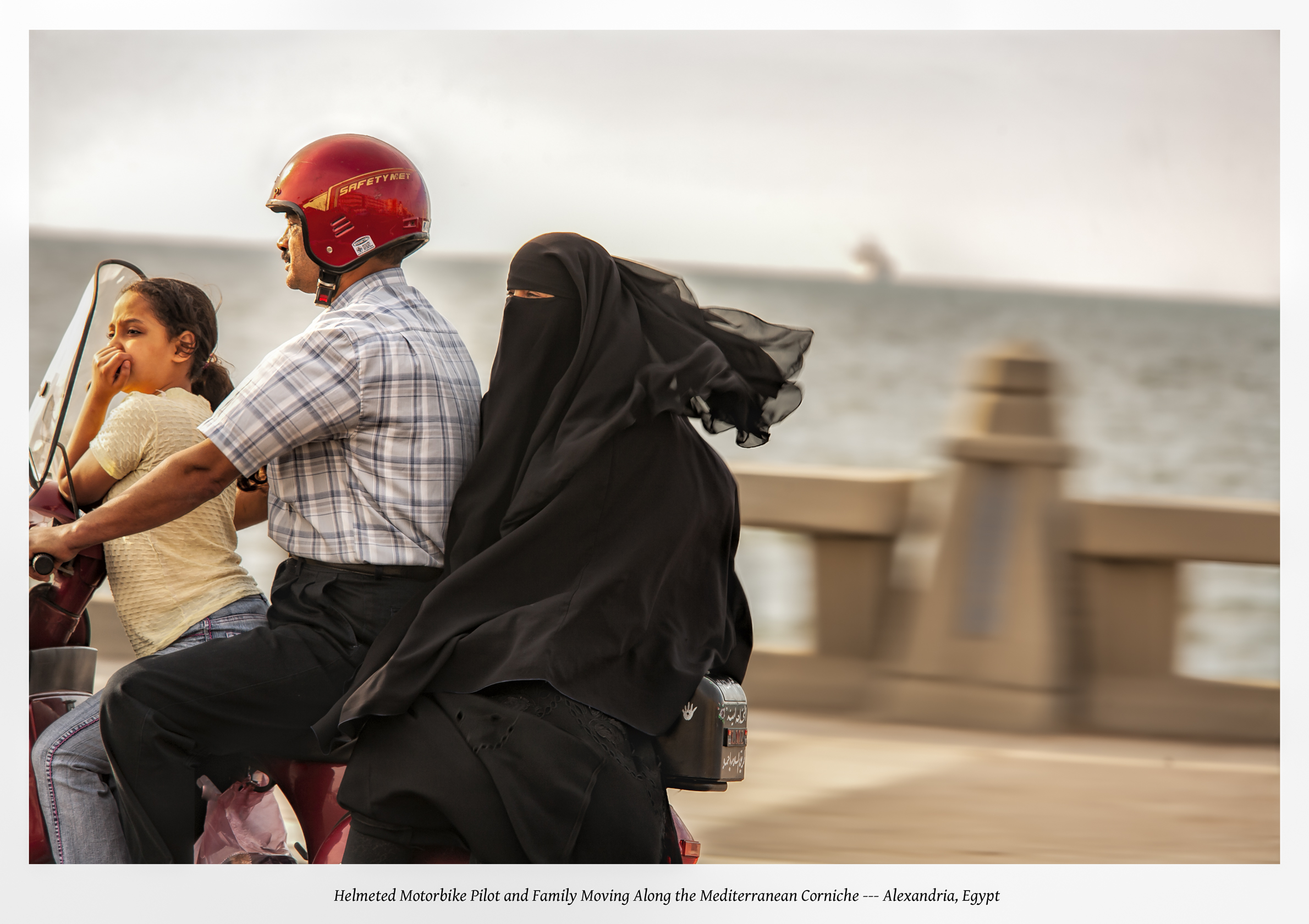 I took this photograph from a taxi moving approximately 50 miles per hour in chaotic traffic; the Levantine Sea forms the backdrop. May we draw conclusions after studying this picture? Perhaps the father’s life is worth more than his daughter’s life and health; or his being-in-the-world has more value than the wife’s existence, who rides precariously side-saddle on the back of the scooter. Maybe they can afford only one helmet. That is a weak excuse: a motorbike is expensive, helmets cheap by comparison and so are Egyptian taxi rides. This whole configuration screams danger and puts me on edge. A sudden stop would catapult the girl into the road and probably injure her brain. The woman in nikab (face-covering) balances on the bike without any restraint — not even holding fast to her husband’s body — and she would surely be thrown into traffic during the slightest accident. The question remains: “What is this man thinking?”