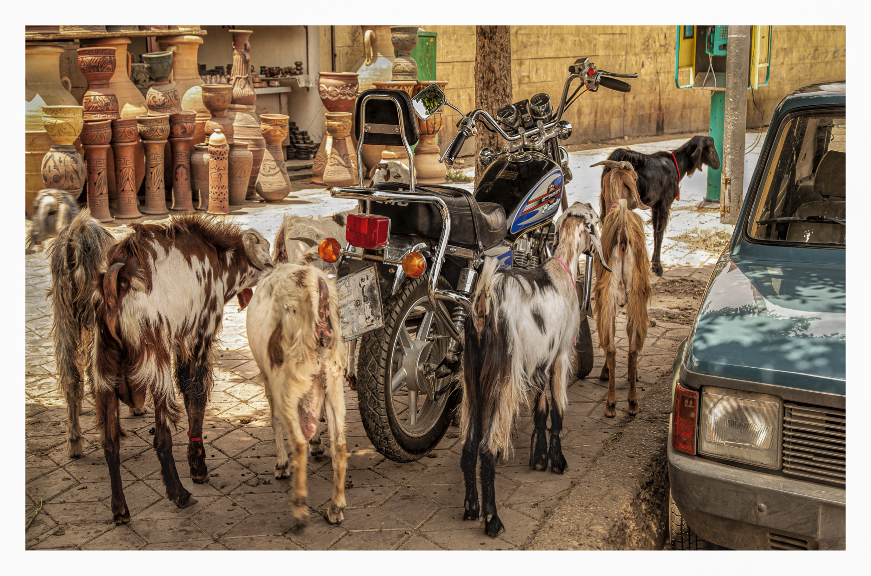 Is our subject the shiny late model motorcycle (a rare sight in this part of the world) surrounded by goats; or rather should we focus on the seven goats surrounding the machine? If I owned the shop in the background selling Egyptian-themed pottery, I would see things my own way. The subject here would be my business and the neighborhood where I sell my products. There seems to me no specificity, no obvious thing-in-itself here; nevertheless the image has an intriguing quality. For me the subject exists on a higher level of abstraction. When I look at the photo, the shaggy goats and their feces covering the sidewalk constitute the motif, but only as the animals serve to illustrate a broader theme. To encapsulate that I offer this: The surprising and delightful things you chance upon when you leave your regimented modern country of origin behind. Can an impression expressed by a sentence like this be the subject of a photograph? Considering the dictates of our famous writers, this would seem impossible; an idea is very far from “polished steel and palpitating flesh.” It is possible my sentence expresses the meaning of the picture, not its subject. But if meaning isn’t our ultimate subject, it seems we are wasting our time pursuing serious-minded photography.