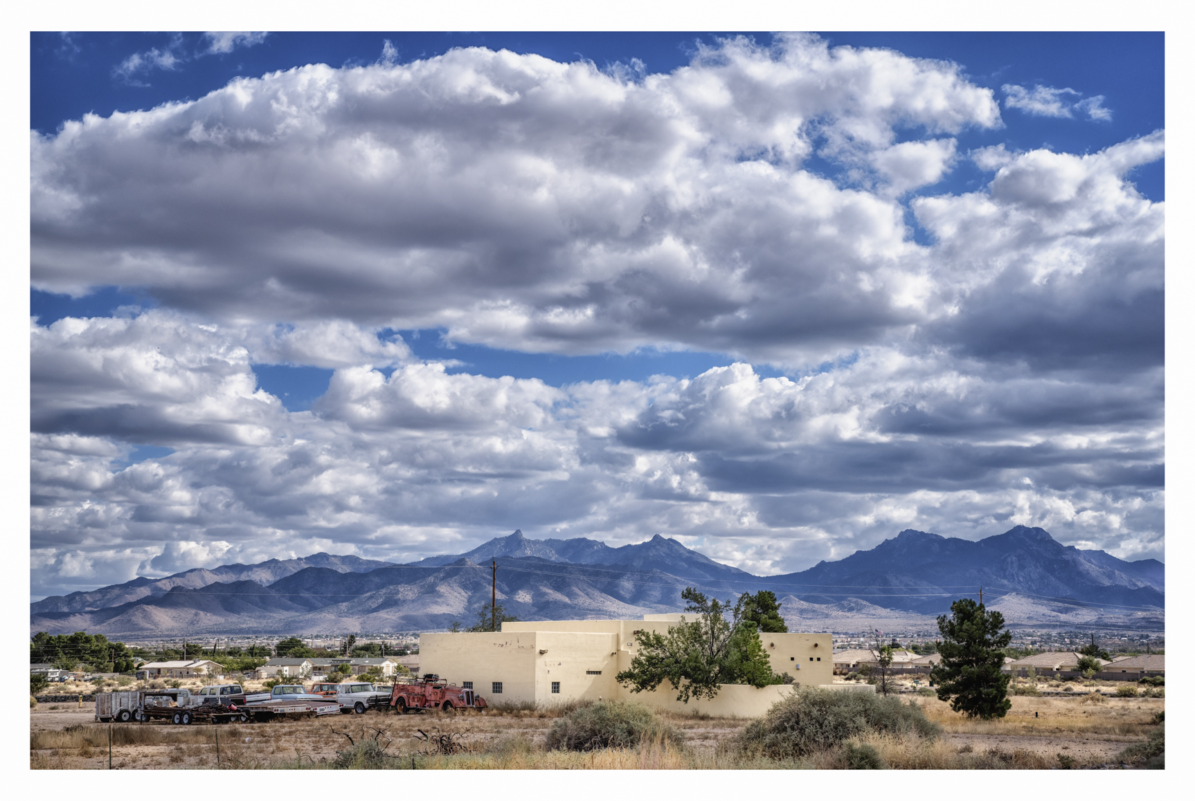 It took me a year to locate the photographic composition above which I believe defines the essence of the place. A similar panorama can be viewed from each of the city’s neighborhoods; none provide this characteristic foreground including rusty fence posts, minimalist architecture and the detritus of automobiles. South of town the sierra rises precipitously in a series of pinnacles. A surprising alpine climate and greenery exists up there, altogether different from the dry plain below. Upon the peaks in winter snow falls and many days throughout the year cloud-forms decorate the sky above the mountains. In the opposite direction, behind me to the northeast as I captured this view, a high-altitude playa stretches out — enormous, seeming to lack boundaries, a landscape which could well serve as a visual representation of Infinity.
