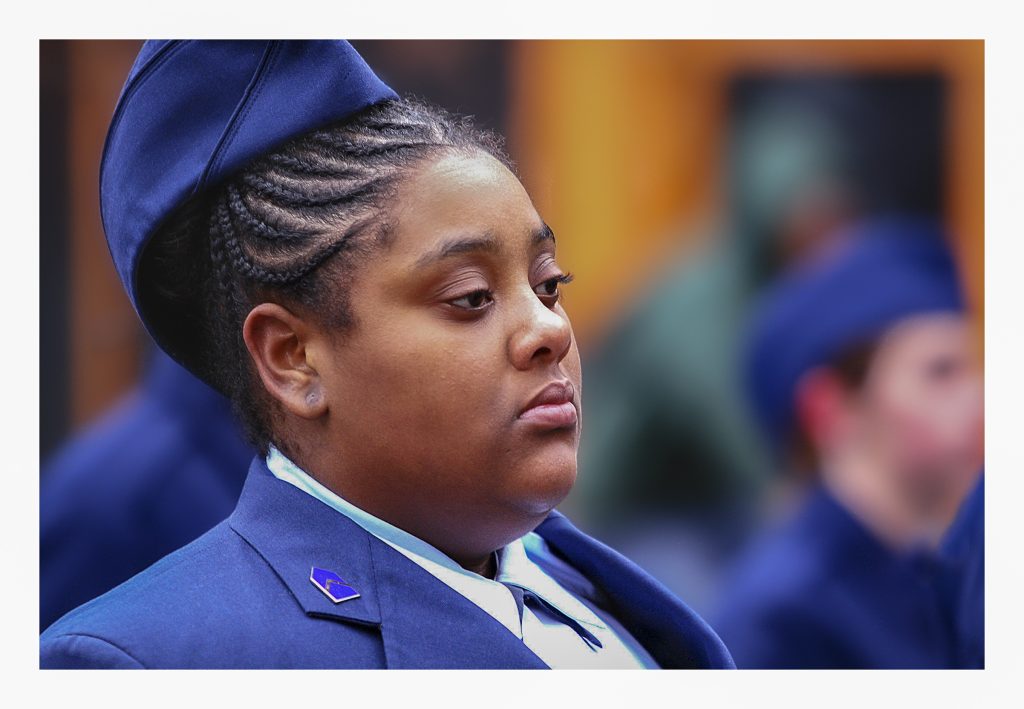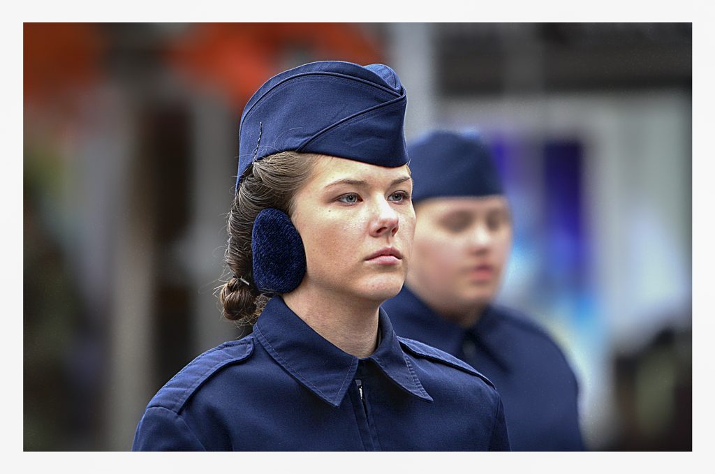 Anyone acquainted with military drills and marching knows your mind cannot wander; concentration on the present moment must be maintained to avoid mistakes and subsequent condemnation by peers and superiors alike. In that sense the women show immediate concern for their standing within their social group, a vital preoccupation for a human being. Each soldierly woman has what seems an earnest, businesslike interest in a future armed forces career; thus a social and political order under a democratic flag — a symbol pointing toward a much larger category of reality (one nation under God) — will likely concern them also, and quite intensely I think.