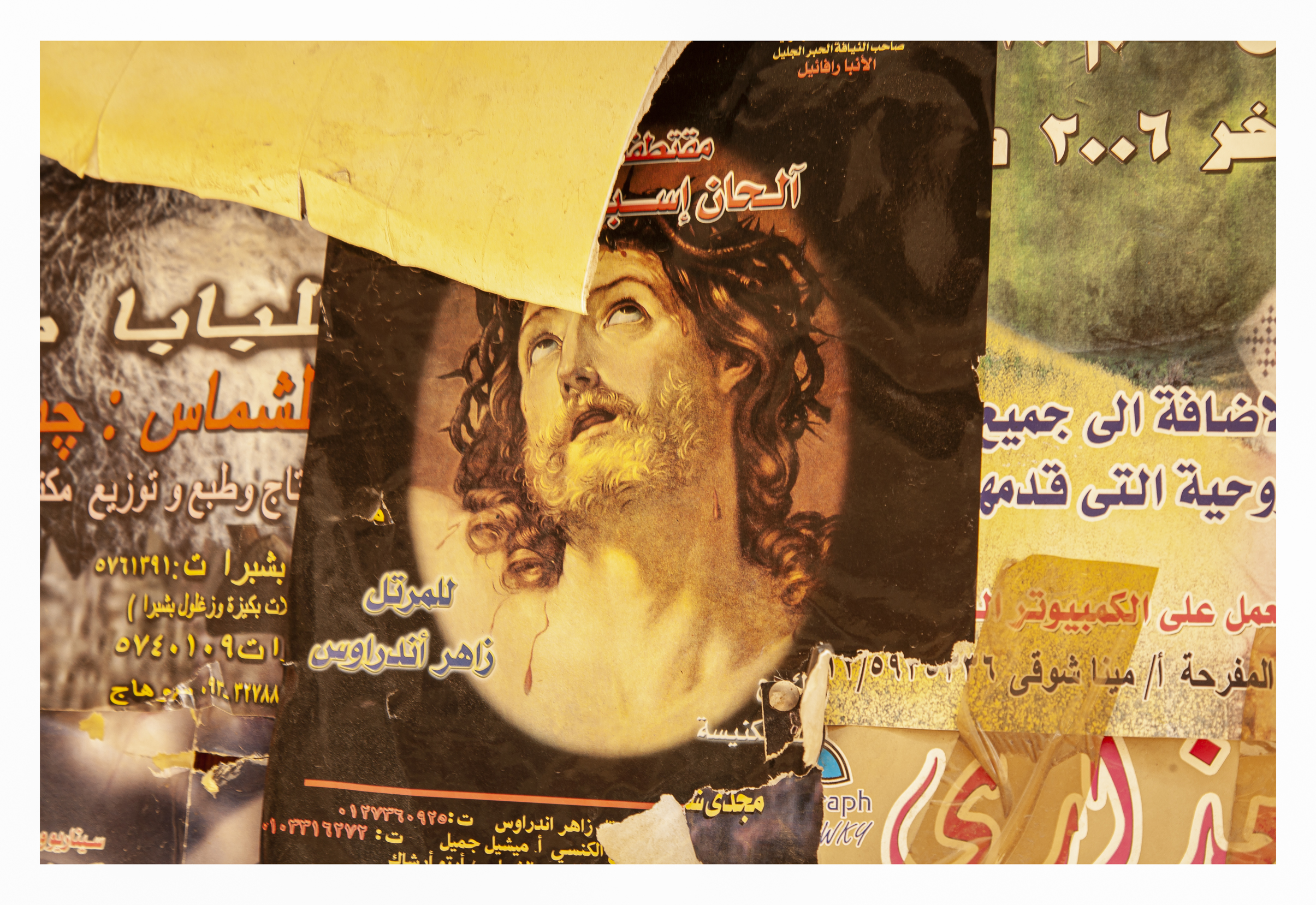 Occasionally you come across something which — at least in your own mind — does not belong in the place where you find it, an anomaly. While wandering the Cairo Necropolis, an inhabited complex of tombs and catacombs in the medieval quarter of the city, I noticed this bedraggled poster seeming unusual in a Muslim cemetery. It depicts Jesus Christ crucified wearing a crown of thorns and appears to advertise a Christian worship service. Although most Muslims respect Jesus as a prophet, they consider the concept of God Himself being put to death impossible to accept and extremely sacrilegious, which explains my surprise at finding this depiction so close by Al-Azhar Mosque and University, the intellectual and theological ground zero of Sunni Islam.