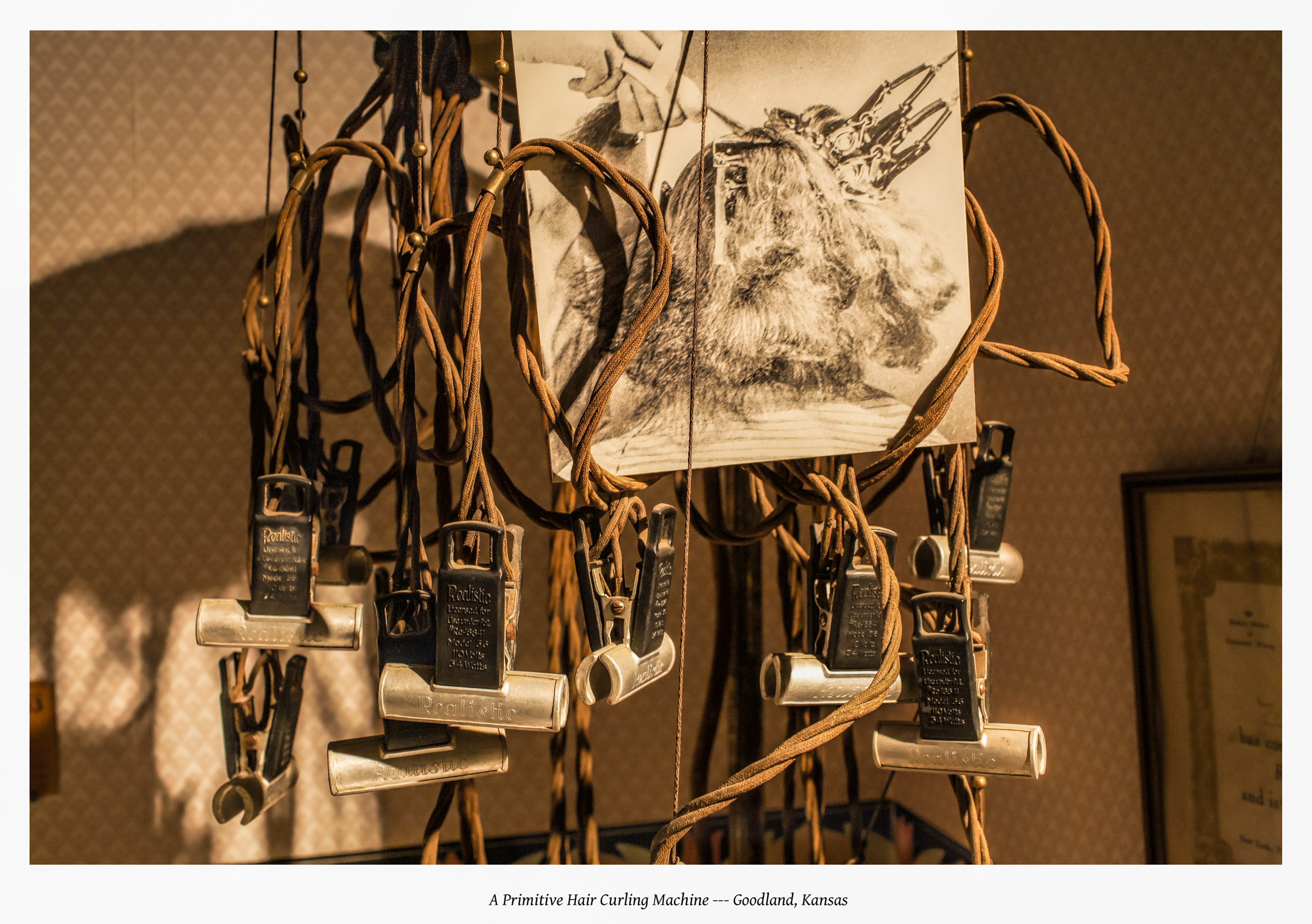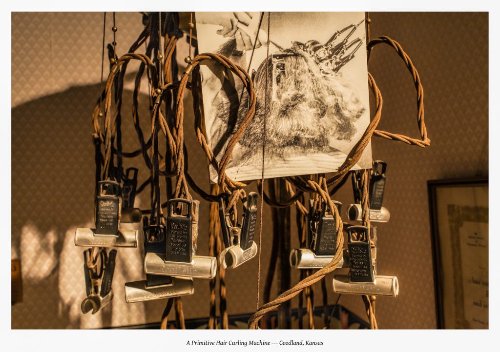 On a trans-continental road trip I spent three nights in Goodland, Kansas, sleeping late and re-building stamina. One afternoon I visited in that provincial, high-plains town a museum of local history; there I came upon this equipment from a distant century. The profusion of wires unnerved me momentarily. Those cables might carry powerful surges of electrons — that fact brought to mind early medical treatments using repeated electro-shocks to the brain, which in retrospect seem so barbaric and perhaps cruel. Spring-loaded clamps dangling from each cord make this seem an instrument of torture more suited to a dungeon than a beauty parlor. The drawing accompanying the exhibit reinforces the frightful impression.