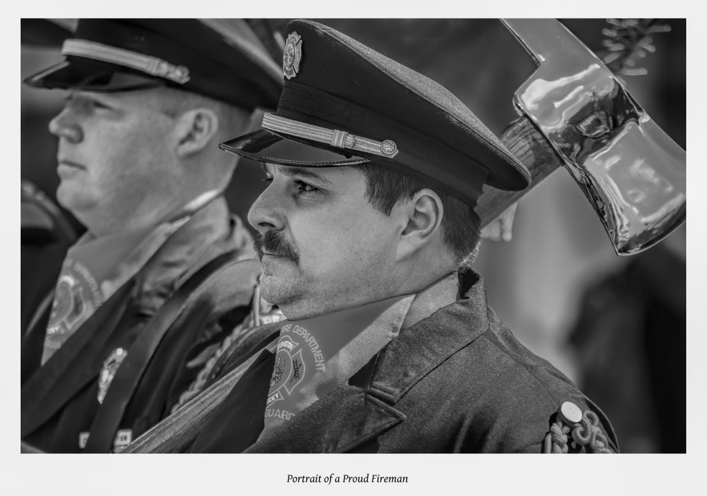 The fireman in our foreground with polished ax seems swollen with pride in his occupation, however not from self-inflation or hubris that comes before a fall. On the contrary his demeanor seems to me without such vanity or arrogance. I see pleasure and satisfaction with his place in life, dignity in his bearing, a healthy regard for himself — all good qualities.