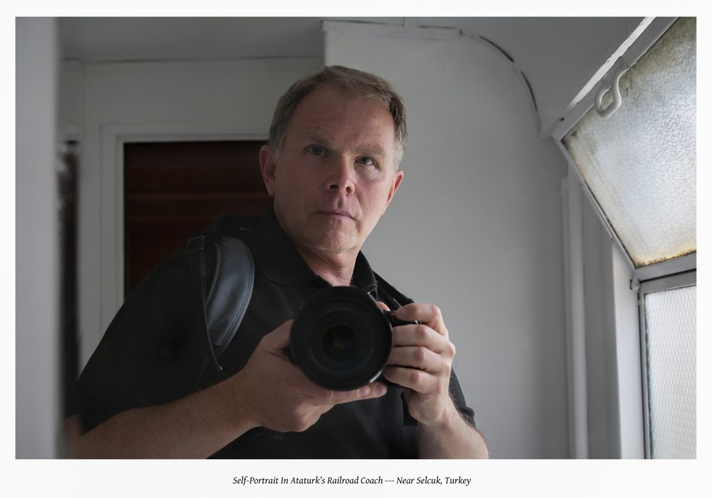 It is a portrait within a mirror-image, an excellent likeness; however this picture has importance for me because of its setting. While traveling by automobile in Turkey we came upon a railroad museum. I began to explore one of its locomotives then noticed a specially-outfitted train car nearby. I stepped inside and realized I had entered the private coach of Atatürk — Father of the Turks — the Turkish equivalent of George Washington. (Each was a military leader who fathered a republic.) Atatürk did amazing things in the 20th century. He was an author, field marshal and revolutionary reformer, a fearless man who euthanized the Ottoman Empire, abolished the caliphate, founded a modern nation, substituted a new alphabet for the old Arabic script and accomplished universal suffrage. And here I am in the 21st century recording myself in Atatürk’s bathroom, assisted by the mirror he used to reflect and shave his own face — an improbable and definitely unforeseen event in my life.