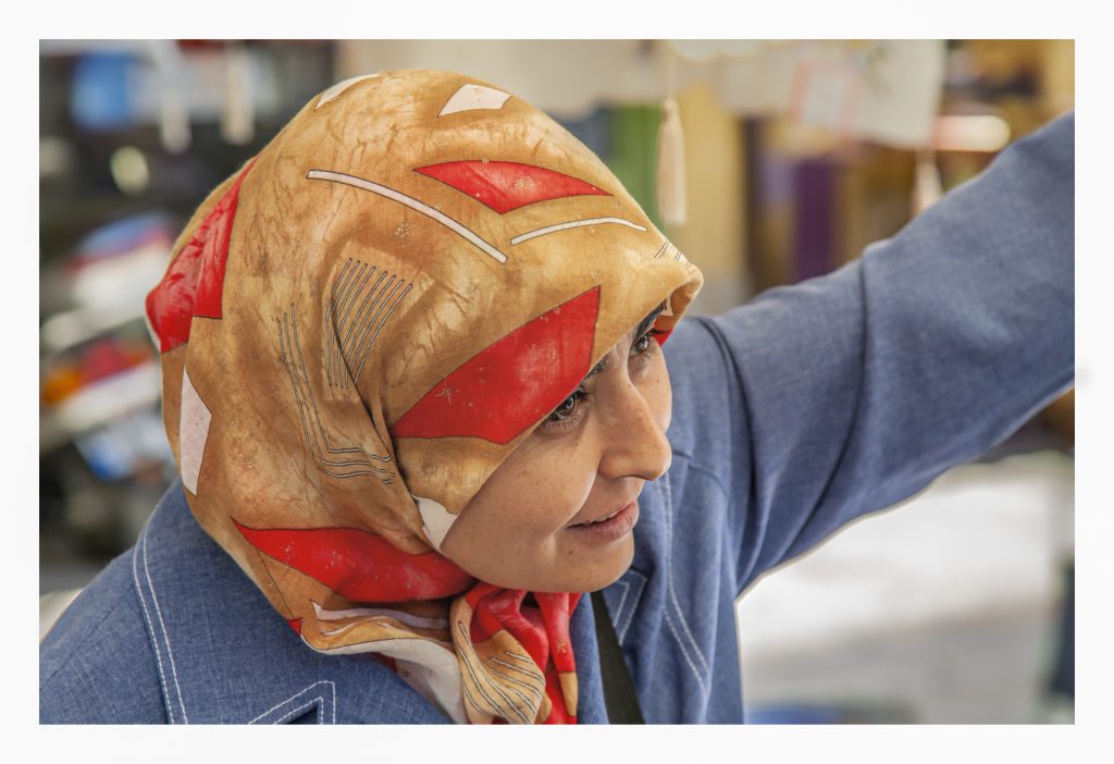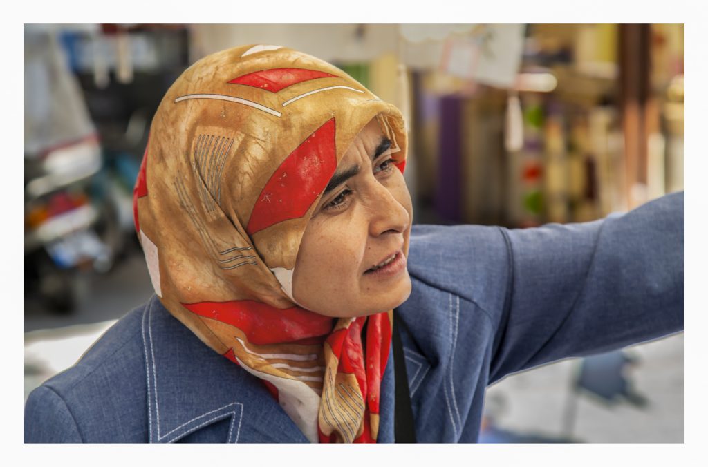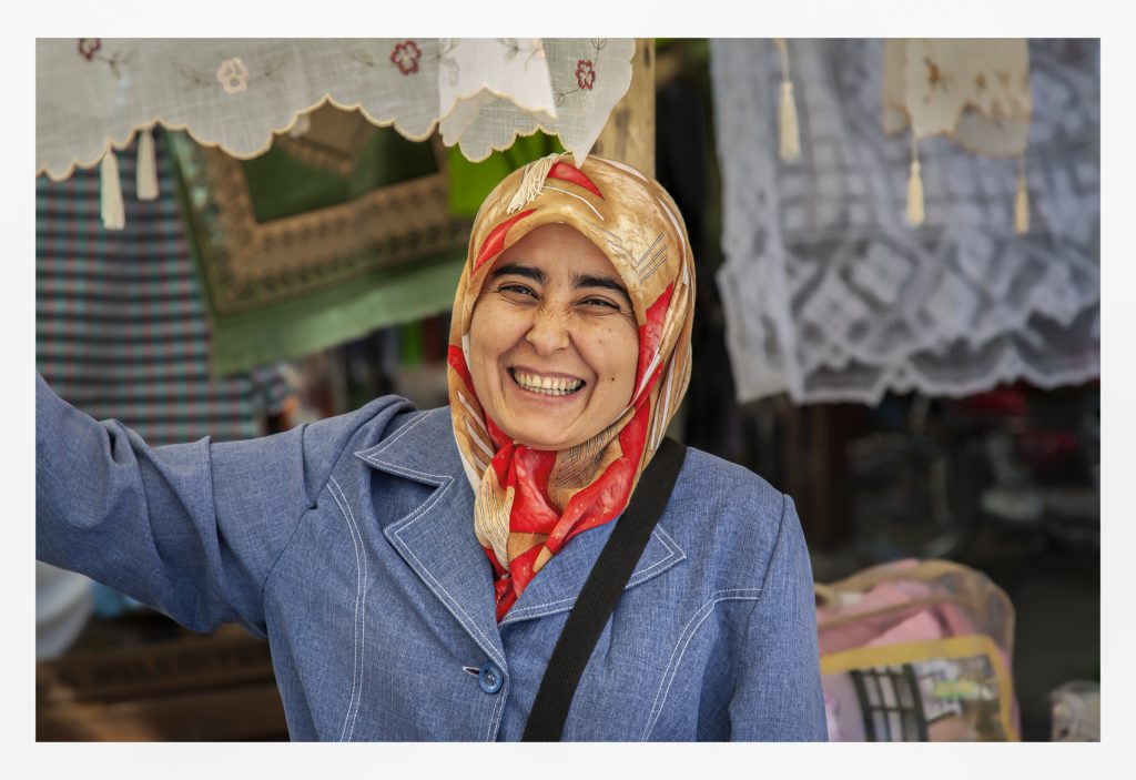 I share four portraits made in a Turkish market — ordered consecutively — beginning with our subject’s salutation. The lady had linens for sale: table-cloths, scarves, bed sheets and other pieces, some expertly embroidered. She was an accomplished actress; at her command she had an array of facial expressions, from greetings to allurements to frowns of disbelief. At the end of this sequence she made a sale. I left the woman’s booth impressed by her skill at persuasion and her dexterity in nonverbal suggestion.