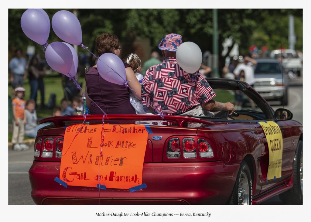 Behind Gail — the mom in our photograph — a flurry of eye-catching balloons injects angular motion into our composition. Gail appears a robust and well-nourished woman about forty, topped in a deep plum color. She dwarfs her daughter Hannah, who wears a tiara and white ribbon on her head and seems to perch uneasily hunched over on her mother’s lap. As mother-daughter look-alike winners they have earned a coveted distinction, thus capturing a much sought-after privilege: they are mounted in royal fashion and glide down the boulevard atop the Spoon Bread Queen’s cherry red Ford Mustang. Concerning the old man seated next to the girls (whose right arm appears badly withered), I can provide no definite explanation. He could be the Grandpa in the drama. Extrapolating from his red, white and blue-checkered fishing hat, and the splashy collage draping his body, we might conclude he is a one among the town’s eccentric characters, a type of colorful individual contained in vast numbers within the borders of Kentucky.