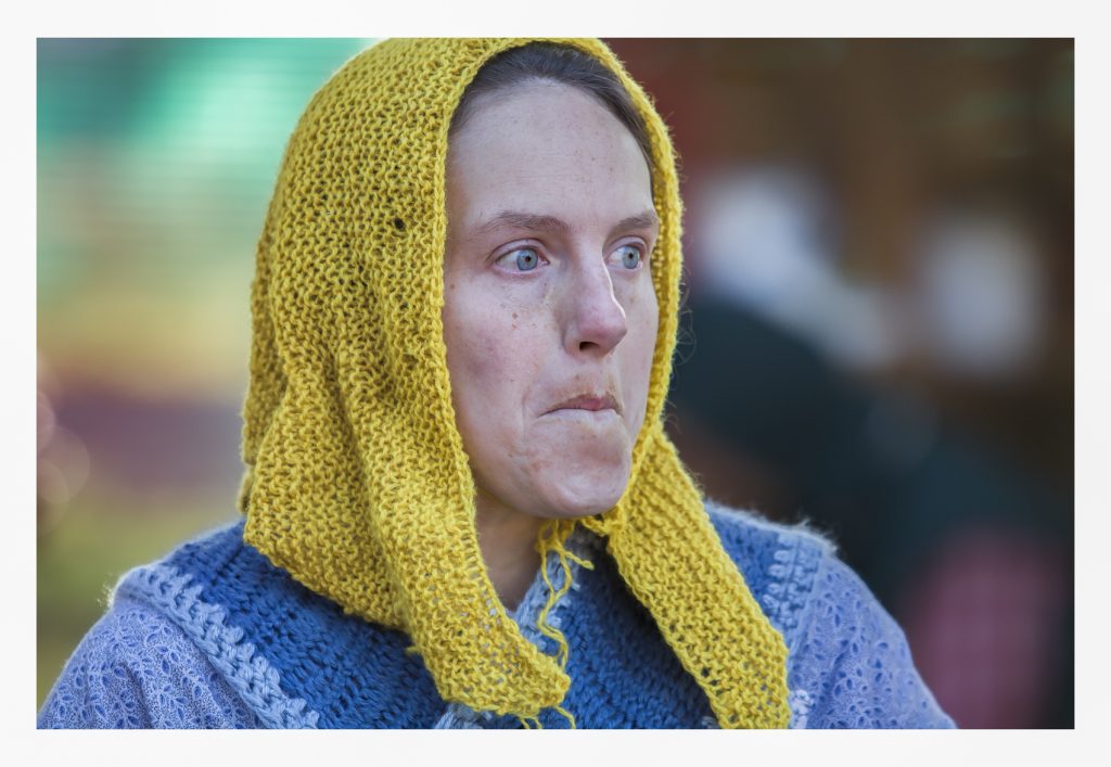 Our subject pulls her face taut against her skull. Her ice-blue eyes bulge under stiffly-arched brows. She locks her stare on the infinite distance where no information exists in a pale sky. This must be private vision and not a reaction to the external world. Whether she is experiencing herself in a purely fictional story — or is enthralled by a scene from her autobiographical past — I do not think we can make a distinction. Her lips purse and repress anger and turn down in sadness at the edges. We might call her gaze: livid resignation, pointing to a disturbance forced upon her. When I analyze the inflections of her nose I imagine I smell ammonia. Her caustic experience appears to weaken her and bother her deep into her shoulders.
