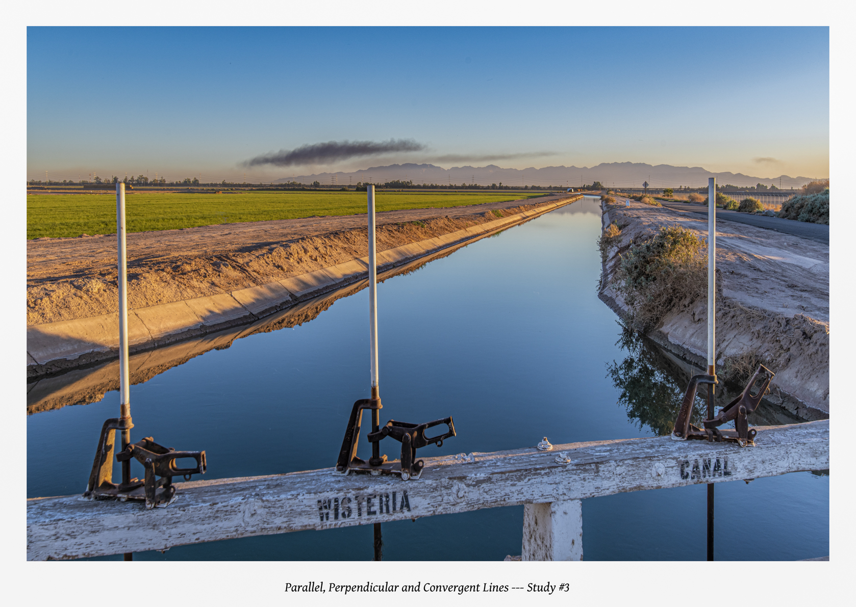Only the rusty hardware in our foreground — fastened to a rail along the Wisteria Canal near Mexicali — saves this image from a colorful but still sterile formalism. The implements have a zoological quality, almost-alive robot animals with their snouts held at differing angles, seeming to express various (imputed) personal attitudes. We find them in a pattern of 3 with 3 parallel pipes entering from above on perpendiculars. Three is a magic number in photography with implications beyond the superficial.
