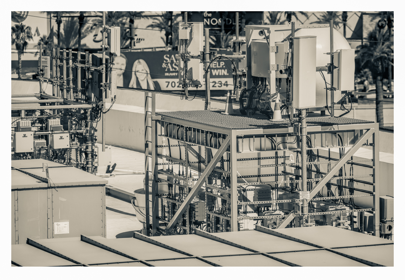Every town depends on it, however Las Vegas lives and breathes networks and has voracious appetites exceeding (it would seem) all other such places. The maze of circuits and their electronic controls — supported in our image by a complicated metal framework — could stand in for the bones, the circulating blood, and the dreams of the city.