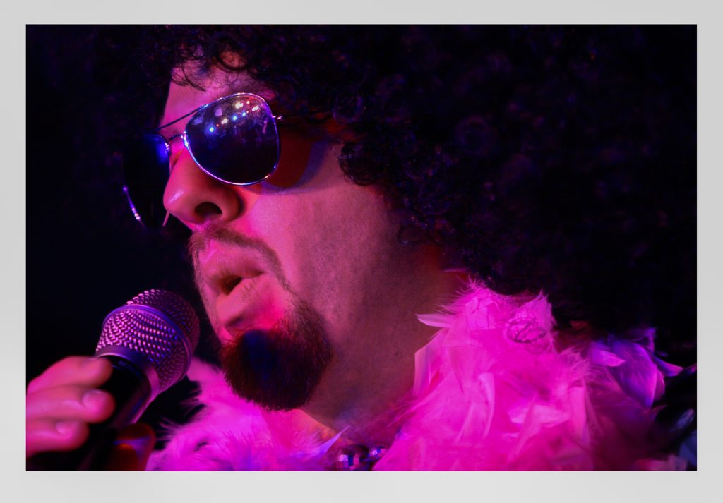 Few of us in our lifetime will achieve the cool aloofness and concentration of this professional musician. And most of us would appear ridiculous (not nearly as hip) wearing a conical, horizontally-striped cap like the one covering our subject’s head. Somehow the keyboardist brings off his unflappable performance with ease and confidence — looking as if he is just cresting the wave of latest fashion. We encounter him working a private bacchanal, the organizers of which embrace a theme: