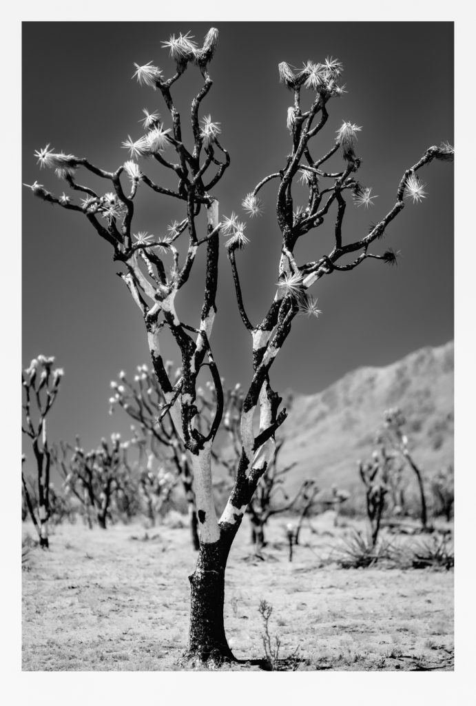 People say forest fires disfigure, destroy beauty, leaving nothing behind but a grim waste. I offer these images — recorded by me two years after the event — as counterexamples. It seems this desert retains aesthetically pleasing qualities. Different shapes have unveiled themselves; new shades of color and new patterns of light and dark have come into being. Some yucca — for example the specimen below — have undergone a metamorphosis. They are no longer trees; instead they have become natural works of art to rival many parallel creations of Homo sapiens.
