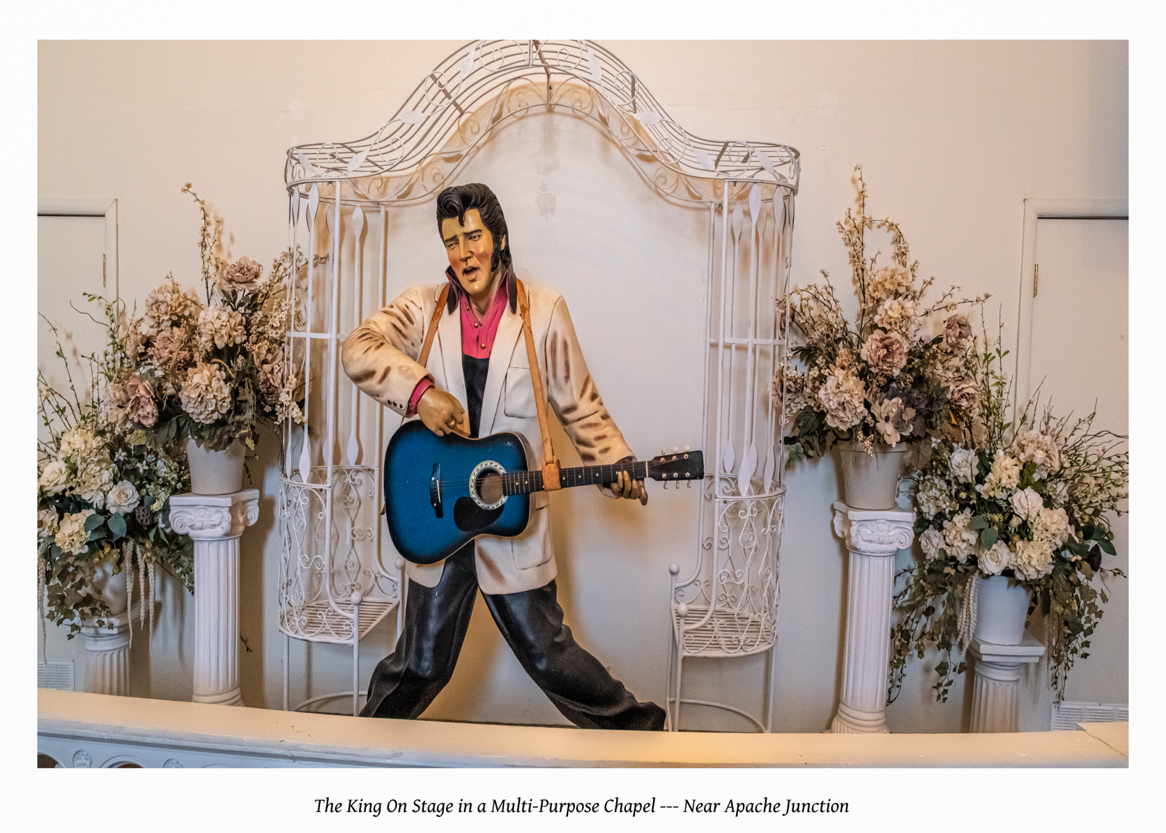 Where an altar and podium usually appear, this chapel features a fiberglass Elvis Presley. With The King of Rock n’ Roll looking on, weddings take place; already married people renew their vows; and various unspecified “commitment ceremonies” are staged. At this venue customers also memorialize deceased fathers, mothers, children, aunts and uncles, and even long-term animal companions. In their advertising the proprietors invite potential celebrants to: “Honor your life’s journey with rites of passage.” In case any sales opportunities have been overlooked, the facility can host unspecified special affairs, yet to be imagined.