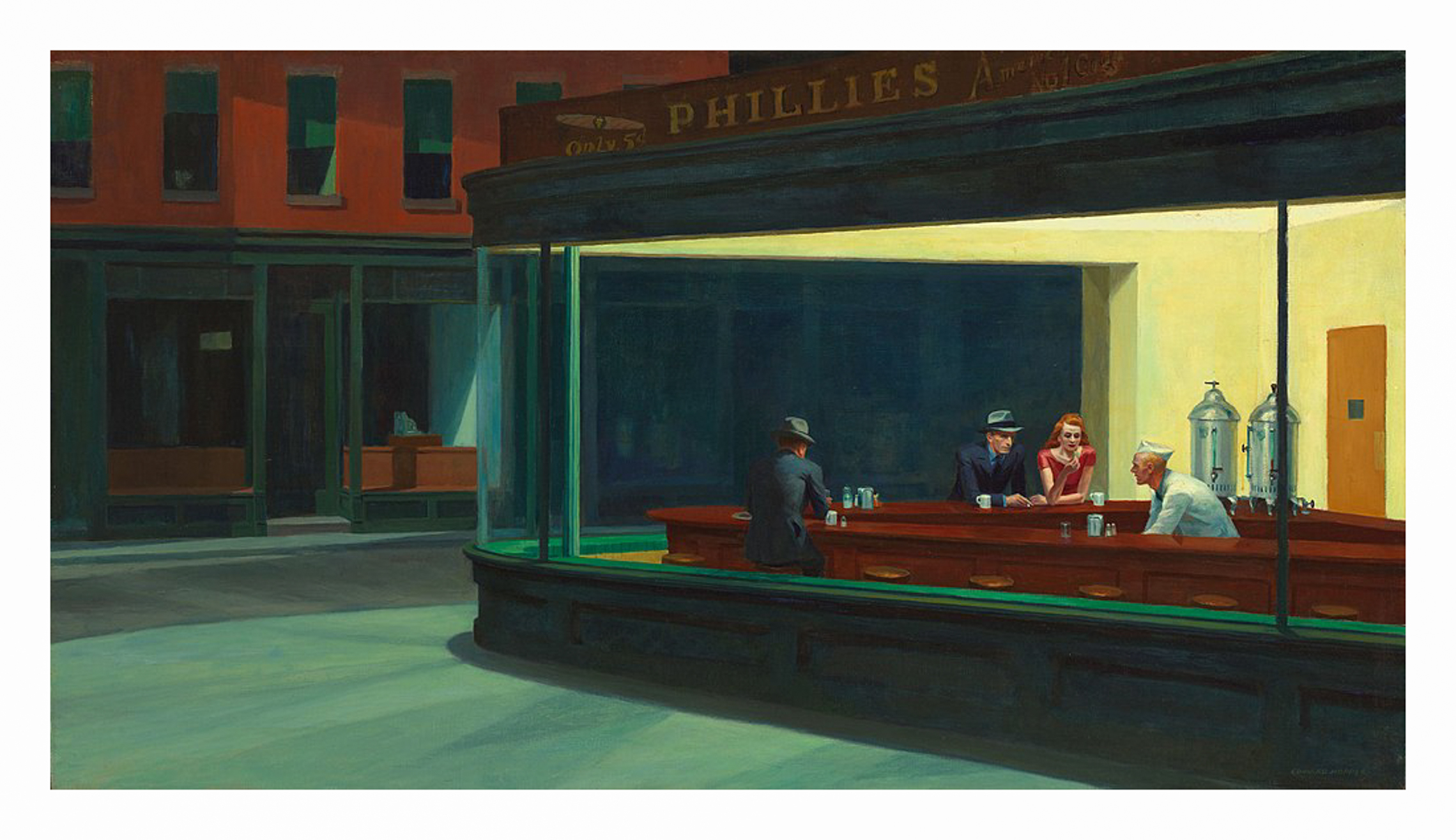 In both pictures architecture seems opposed to the human subjects, appearing to oppress rather than shelter them. In Nighthawks we behold an interior lit by yellow light — normally a warm illumination — except here in Edward Hopper’s reality it tends toward cool greens and blues, giving us the impression we are deep underwater in ocean silence, and the people: our aquatic specimens. The converging lines of the huge window lead from right-to-left over the picture-plane, bringing us exactly nowhere; to a failed business, an abandoned storefront; upstairs the rooms seem unheated and unoccupied; through one window on the extreme left we can barely perceive a figure. It is vague; it could be a deformed human head, a cat, a piece of ceramic — we are left hanging.