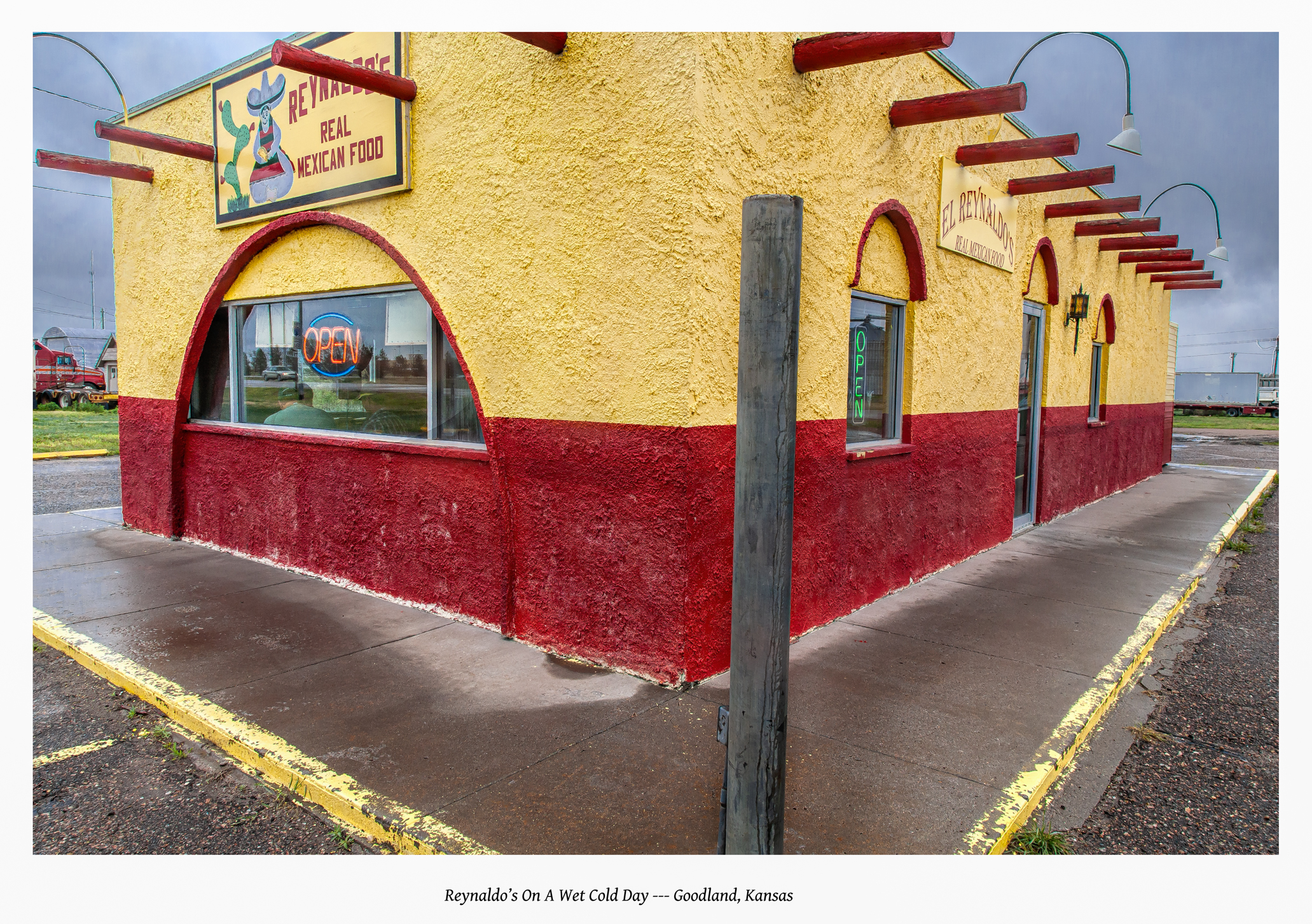 I had driven a thousand miles west stopping just once to sleep. On the high plains of Kansas I ran into sleet and bitter winds. For reasons unknown, I am without luck in these situations; again and again forced into remote towns under heavy weather, where travelers confront poor choices among accommodations. That night — and for the next two running — I recuperated in a motel which itself was undergoing rejuvenation. Paint fumes, the tarps, the mountains of smelly carpet-chunks, dodging to avoid scaffolding and electrical cords, enduring all that clamorous activity finally drained me, sent me into Goodland City seeking calmness, hoping for quiet solitude and a nutritious meal. I found this almost-empty Mexican restaurant next to a railroad yard.