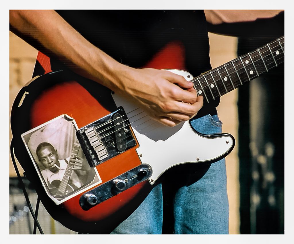 Ask a painter, musician, writer — anyone practicing a difficult art to confide their heroes; they usually will not hesitate. Their mentors form part of themselves and therefore come immediately to mind. This guitarist places a tribute to his ancestor out-front in a famous photograph of Robert Johnson — Mississippi Blues player, originator, composer and mythical personality. I made the image on a sidewalk in front of a music store in Clarksdale, Mississippi. The musician performed for people passing by on the street. On occasion a dozen people would pause and listen to him run through familiar blues configurations.