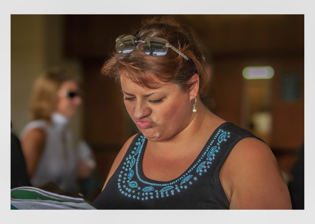 If life, liberty and all of the future depended on it, I could not recreate on my face this expression of pure chagrin. I recorded the lady at a race track in Middle America. Catching her reaction to the racing form she holds in both hands was a miracle of synchronicity. No doubt her afternoon betting on horses has left her feeling disquieted.