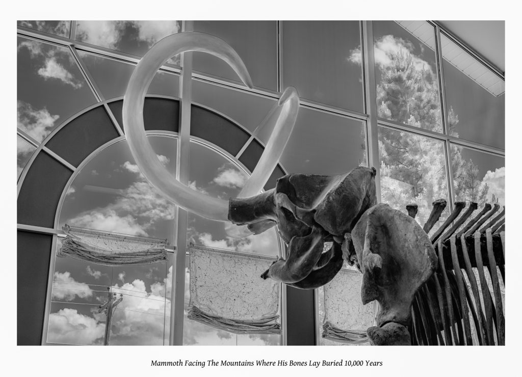 The image engenders (at least in me) strangely intense empathetic feelings, a sense of loss and longing, an identification with our subject. This re-assembled tusker no doubt represents one of the last of his species to walk the Earth; woolly mammoths have vanished, remaindering only genetic information and fossil skeletons. This realization in itself provokes mournful emotions. Qualified experts speculate our ancient pachyderm behaved socially like modern African elephants, with similar intelligence and developed consciousness. In that case, the mammoths would have formed strong emotional bonds with their kin, and did have the ability to form long-held, highly-accurate memories.